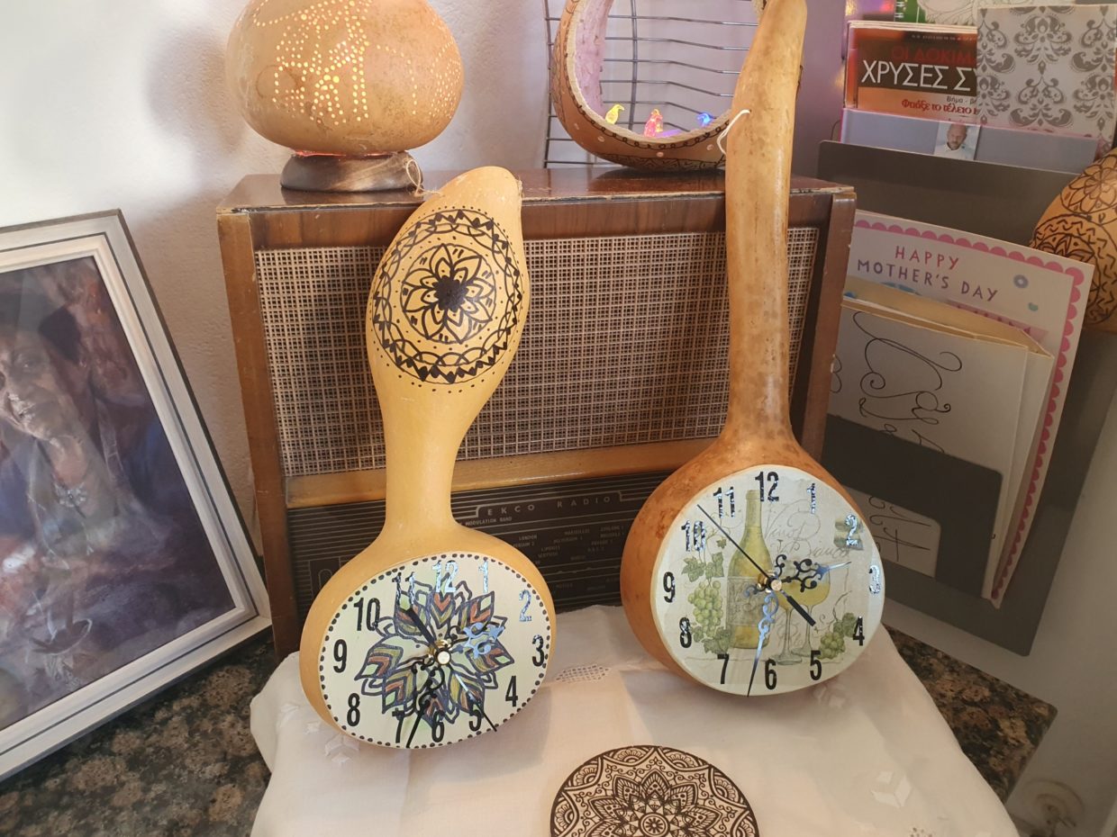 The innovation through the years is the deviation from traditional Lefkaritiko decoration to more modern techniques, designs, colours, uses etc. New and innovative uses include: Gourd clocks, lampshades, bird houses, special cups and bowls and many more. From the wide variety of gourd shapes and sizes other art pieces can be created, including: ornaments, sculpture, vases, and wall art such as masks.