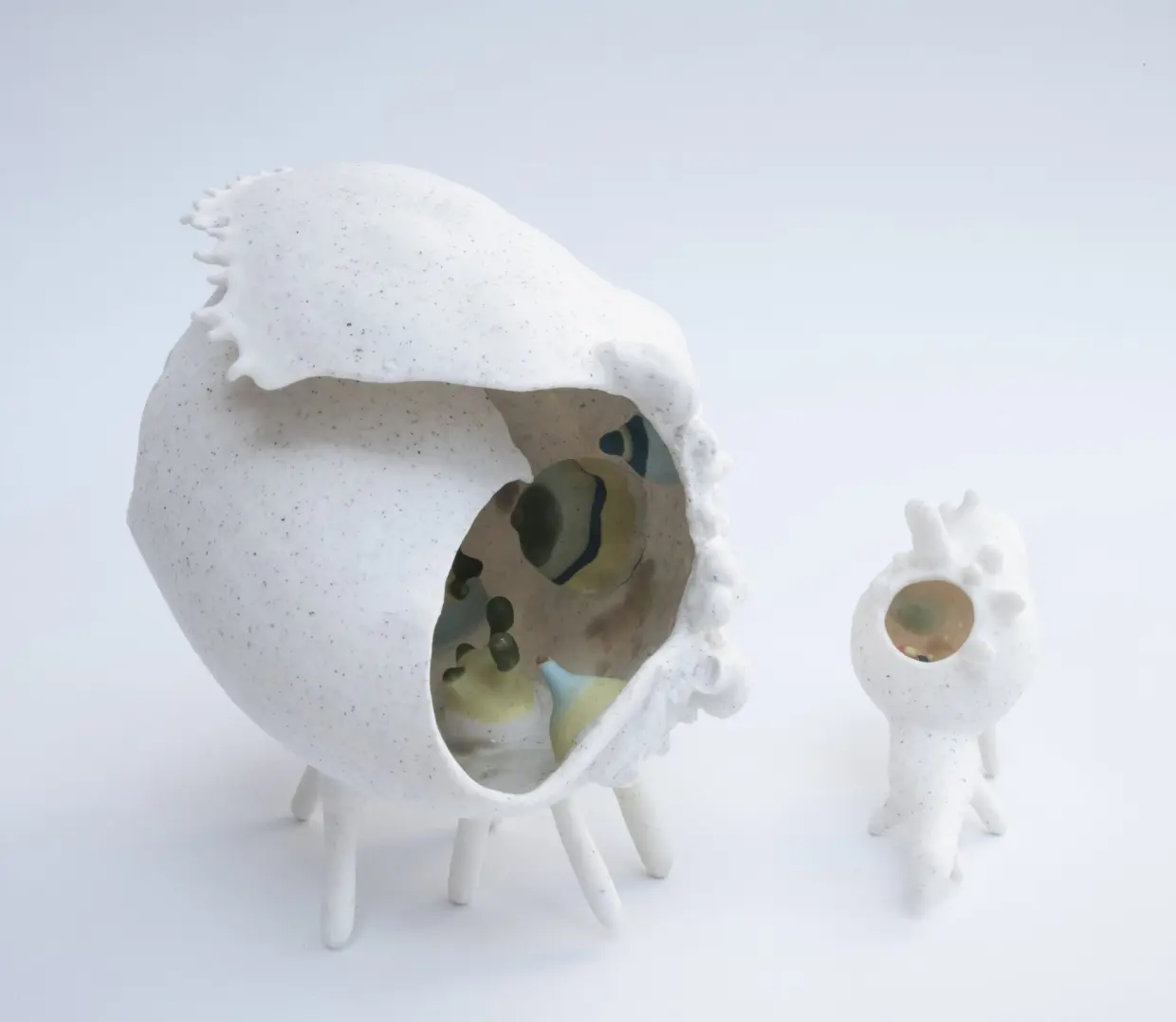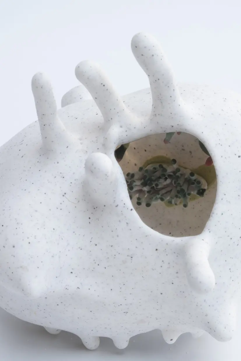I scrutinize its imperfections, its tensions, its textures: wrinkles, growths, all testimonies to an intimate history. Porcelain then becomes a living membrane, capturing the fragility and beauty of this surface. Beyond appearances, my sculptures invite an inner journey. Openings reveal colorful and mysterious worlds, in constant dialogue with the outside.