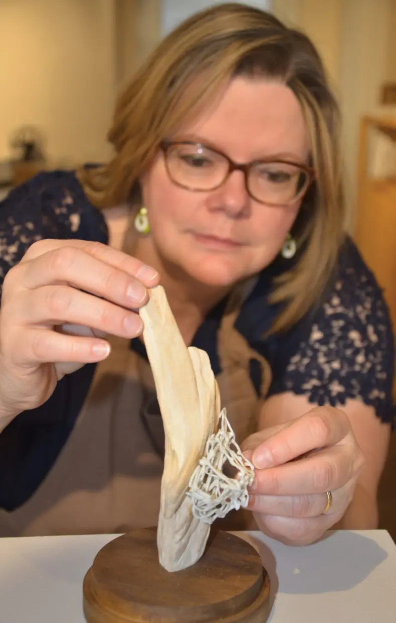 Pièces décoratives, utilitaires, bijoux, la gamme de recherche de la créatrice est large, tout comme l’exploration des différentes techniques qui l’ont amenée à développer la sienne : porcelaine coulée à la cuillère.