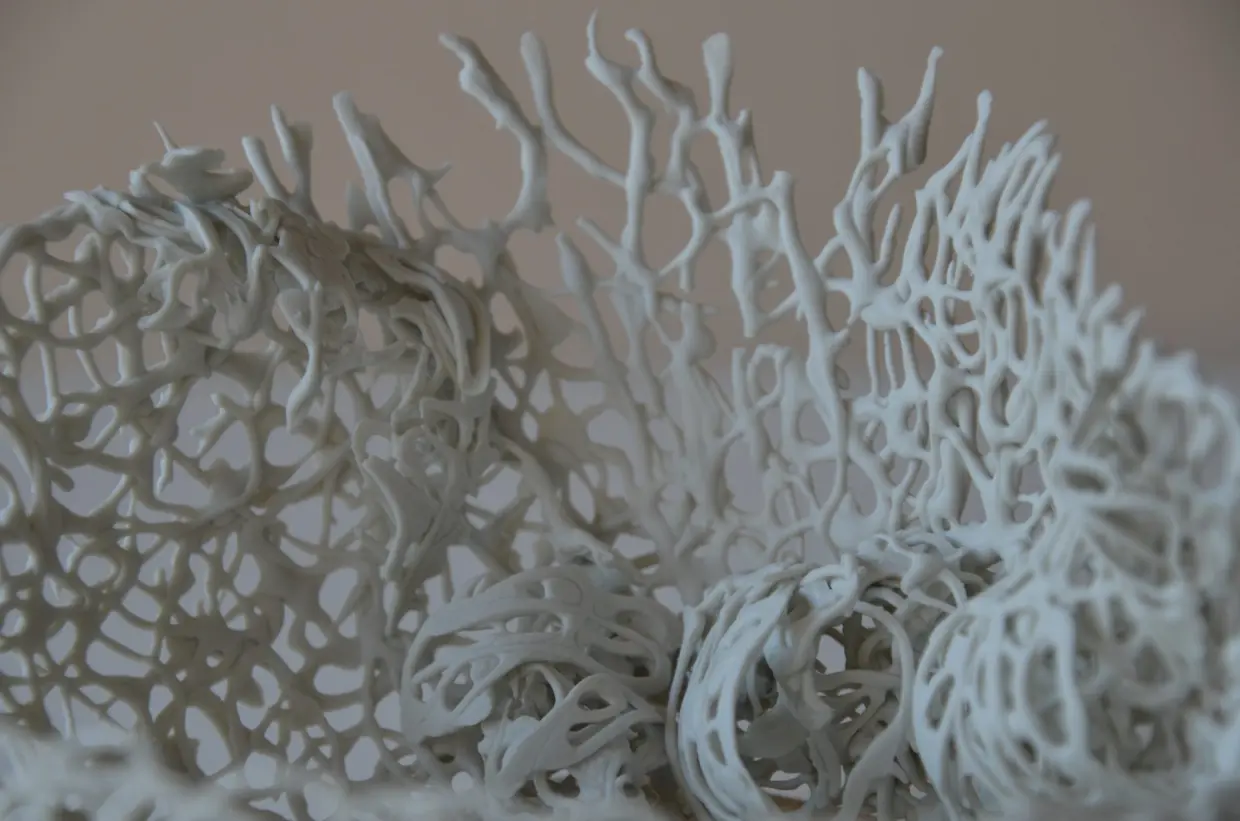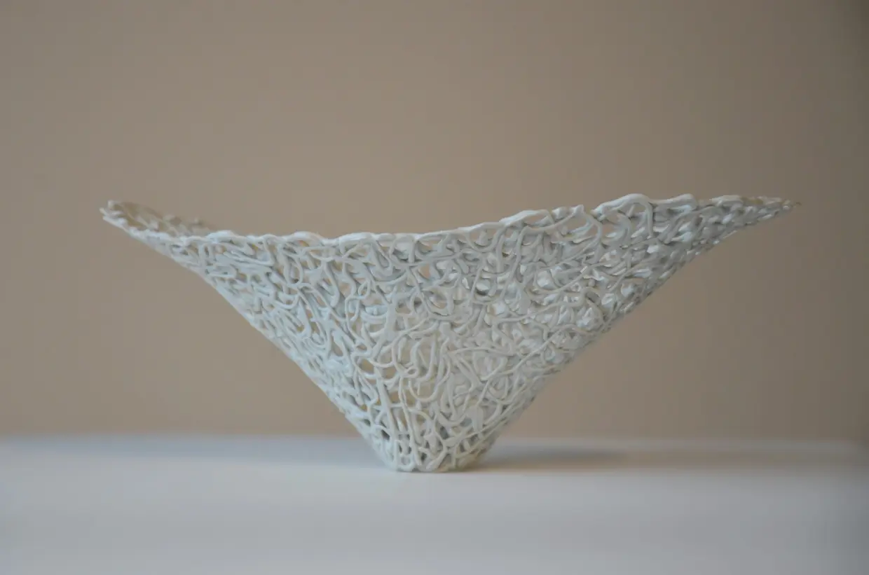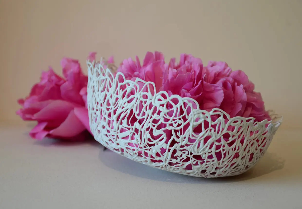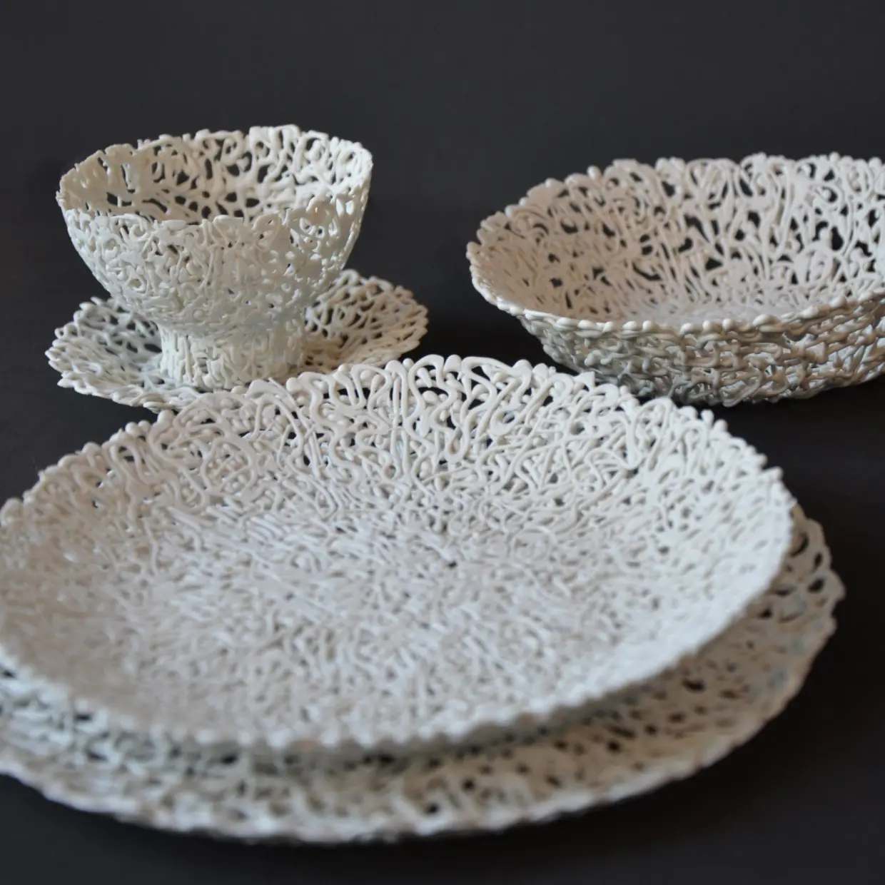 Piezas decorativas, objetos utilitarios y joyas reflejan la amplitud de su investigación, así como la exploración de diferentes técnicas, que la han llevado a desarrollar la suya propia: porcelana vertida con cuchara.