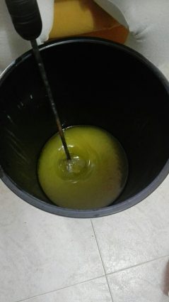 I materiali utilizzati sono oli di produzione propria (olio d’oliva invecchiato non utilizzato) il miele, l’aloe vera, l’olio essenziale di lavanda e il latte, tutti materiali che compro da produttori della zona e la glicerina la acquisto da un fornitore dei laboratori. Per il sapone per bucato si usa l’olio esausto e non applica la riduzione della soda.
