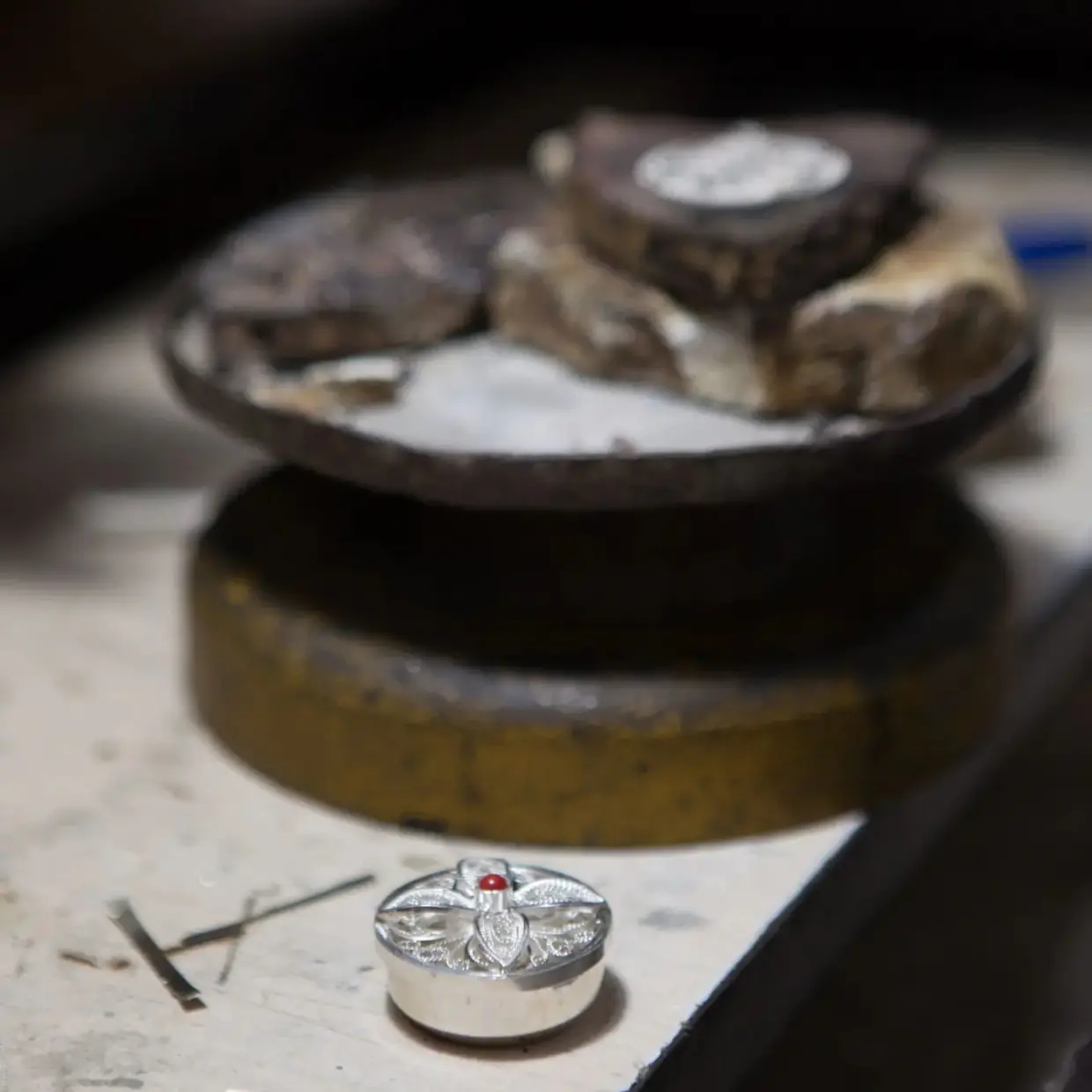 Alongside the enamel technique, she is also skilled in metal chasing and filigree, which are considered among the oldest techniques in jewellery making. She learned to work with metal and natural stones from her father, and later continued her studies at the Patriarchate’s College, Faculty of Enamel. After graduating from college, she continued the family tradition and began working together with her brother using various jewellery techniques, including chasing and filigree.